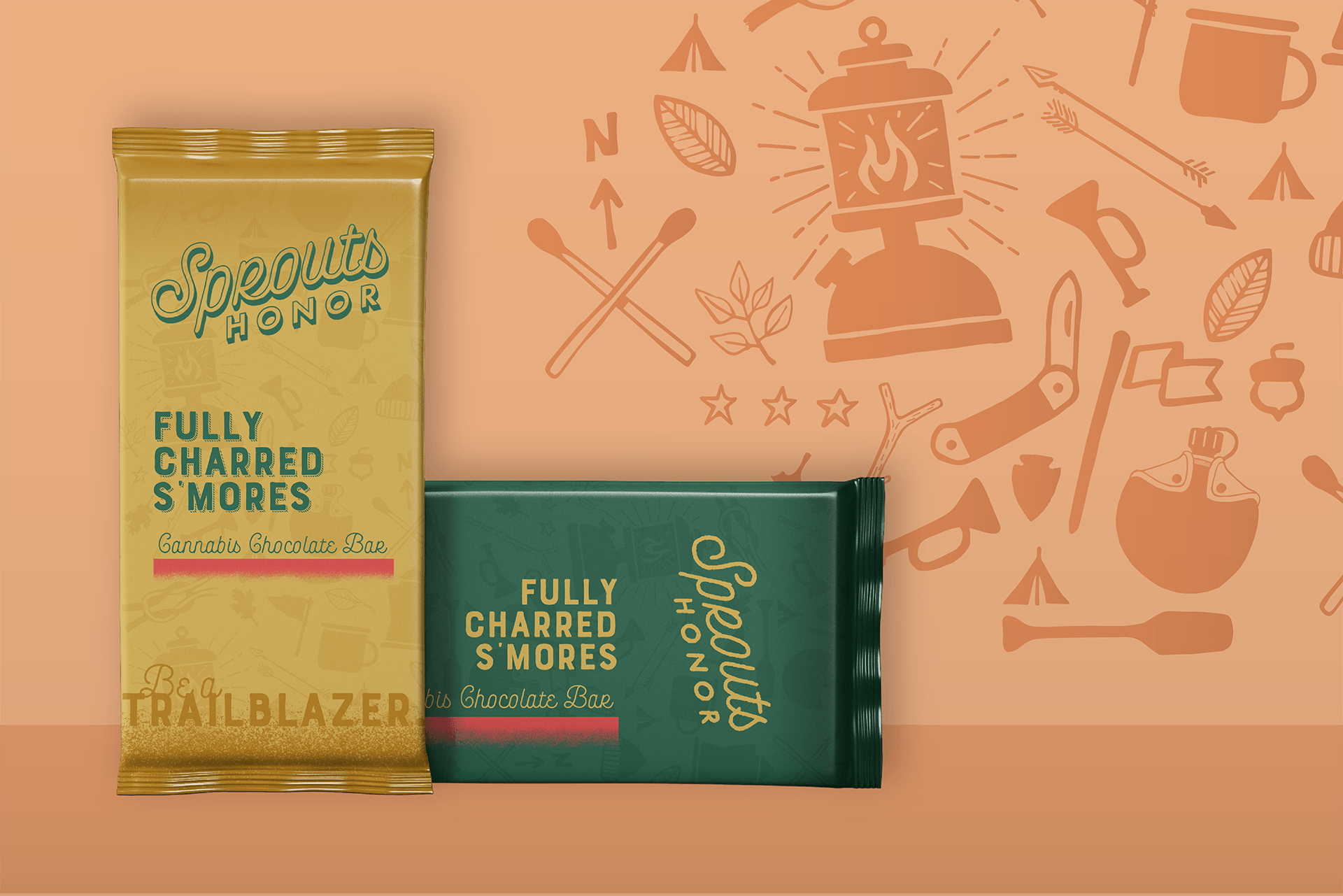 As a cheeky addition to our presentation, we also named and branded an original product line. The Sprouts Honor brand was made for CBD-infused brownies and chocolate bars. The name and tagline, be a trailblazer, have serious camp vibes, which inspired the packaging design.
